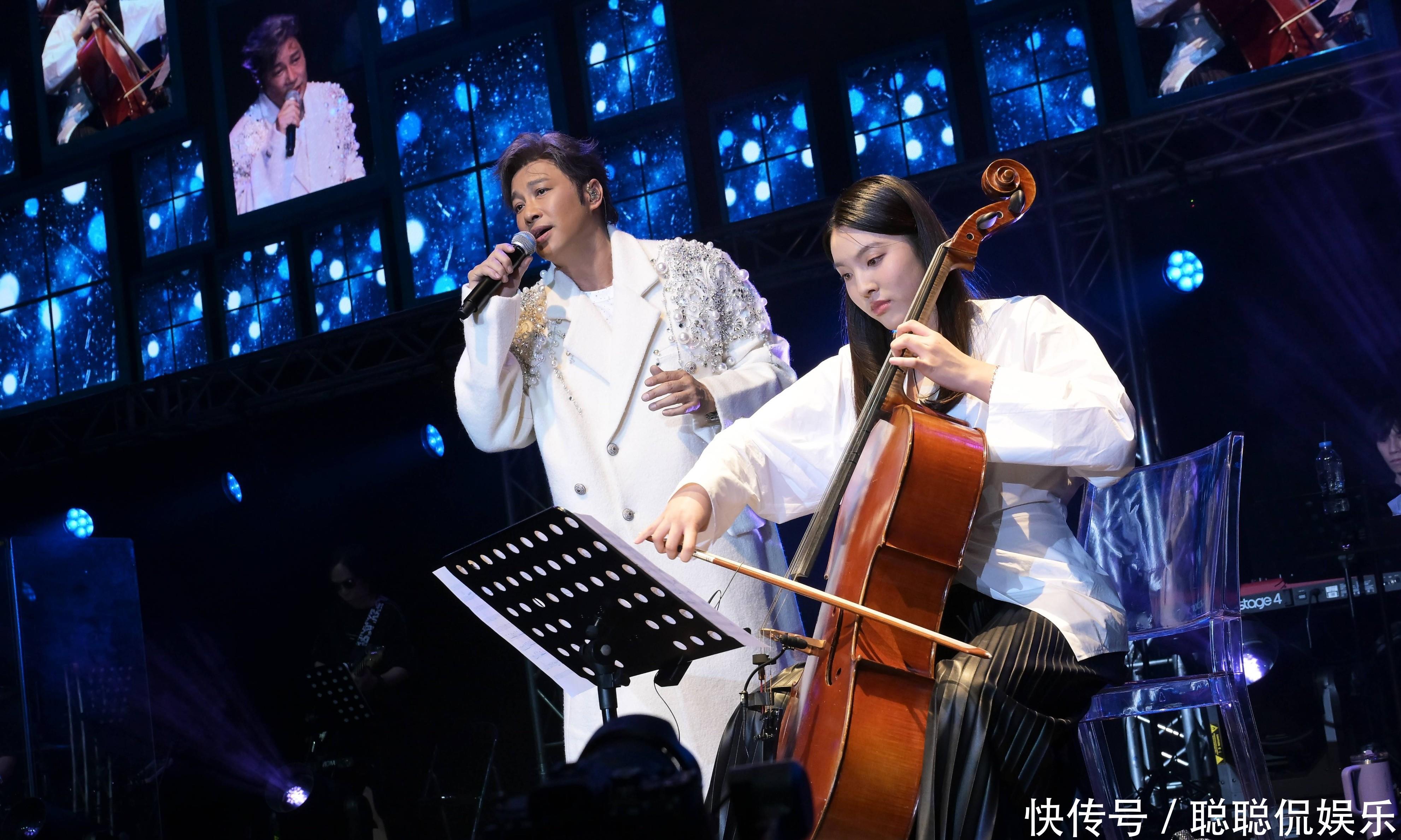 紧接着,他又连唱《黑夜的豹》《坏女孩》等经典歌曲,同时致敬了和梅艳芳同年逝世的张国荣。演唱会进行到一半,意外惊喜出现了。谭耀文在演唱《烽火情天》时,舞台一侧突然走上一个小姑娘,抱着大提琴为他伴奏,正是他的女儿津如。